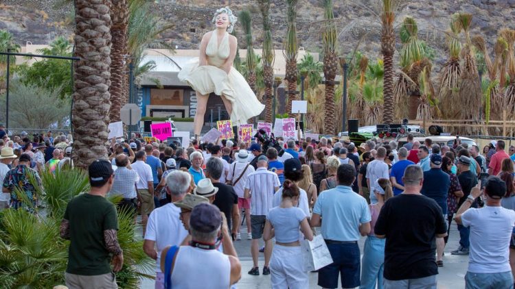 “The event, which drew hundreds of attendees despite triple-digit temperatures, included DJ music from Alf Alpha and a vintage aircraft flyover from the Palm Springs Air Museum. A formal ‘unveiling’ was scrapped due to high winds. Protesters gathered near the statue site at the corner of Museum Way and Belardo Road ahead of the main hour-long event, which kicked off around 7 p.m. Many of the ‘Forever Marilyn’ opponents wore pink, while some supporters wore white.