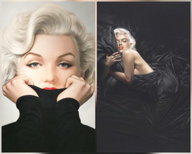German artist Michael Moebius is best known for his images of celebrities chewing gum. His 2015 portrait of Marilyn – based on a 1962 photo by Bert Stern – has gone viral, and can now be found on posters, T-shirts and cell-phone cases (sometimes with the caption, ‘being normal is boring’ – not a verifiable quote, by the way!) Moebius has also created other portraits of Marilyn based on her photo shoots with Alfred Eisenstaedt and Douglas Kirkland