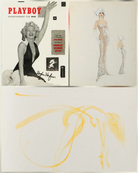 A first edition of Playboy‘s debut issue – signed by Hugh Hefner – sold for $48,500; a costume sketch (and fabric swatch) for the ‘Happy Birthday Mr President’ dress fetched $50,00; and Marilyn’s watercolour painting, ‘Myself, Exercising,’ reached $125,00.