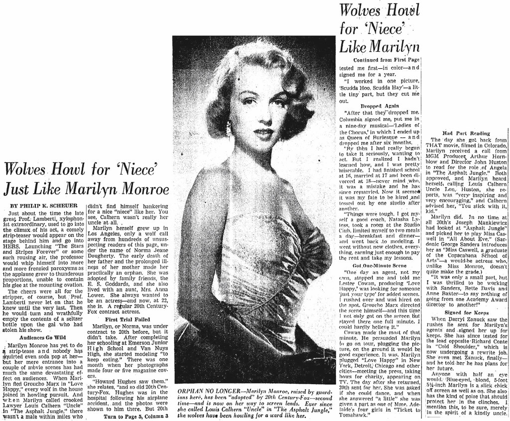 And as the article notes elsewhere, The Asphalt Jungle – although critically acclaimed and Oscar-nominated – was not a huge commercial success when first released. Nonetheless, it was a springboard for Marilyn’s burgeoning career, with early viewers singling out her luscious presence in an otherwise bleak picture.