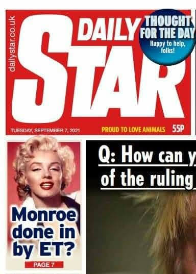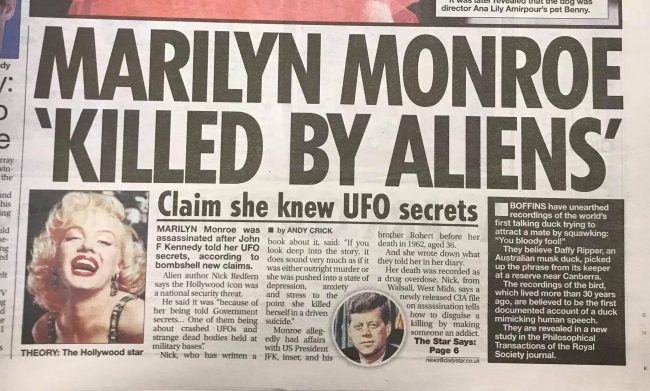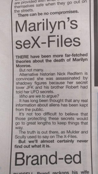 Now UK tabloid the Daily Star has covered Redfern’s claim in today’s edition – with tongue firmly in cheek, as the front page asks readers, ‘Monroe Done in By ET?’ The article is also referenced in today’s editorial, under the cheeky subheading, ‘Marilyn’s seX-Files.’ (In all fairness to Redfern, he is not quoted in the article as saying she was killed by aliens, as the headlines imply.)