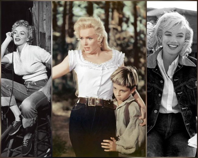Marilyn’s bejeaned role as saloon singer turned pioneer woman Kay Weston in River Of No Return (1954) is listed among 40 Iconic Denim Moments in Movie History over at Harper’s Bazaar – although Clash By Night (1952) and The Misfits (1961) surely deserve honourable mention. She looked “rustic and stylish,” Charlotte Chilton writes, in “dark high-waisted jeans, a white cotton shirt, and a wide, brown belt.” Other screen queens noted for their denim style include Grace Kelly (in Rear Window), Audrey Hepburn (Breakfast at Tiffany’s), and Brigitte Bardot (La Verité.)