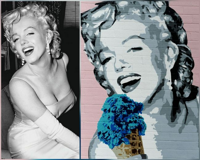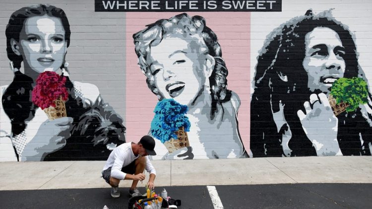 “The mural shows three retro icons — Marilyn Monroe, Bob Marley and Judy Garland, as Dorothy with Toto — with colorful ice cream cones. The icons are in grayscale.