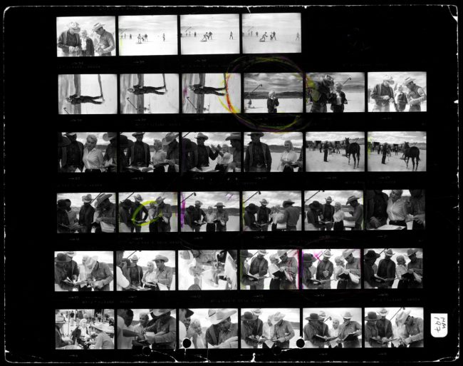 “I remember being particularly drawn to this image of Marilyn in the desert learning her lines. I didn’t know the backstory at the time but there was something mesmerizing about the way the picture was composed … A few years later I was looking through Eve’s contact sheets and saw the full contact sheet this image was taken from. I was quite taken aback. None of the other images on the sheet looked anything like this one. I had imagined that Eve had set the scene up knowing what she wanted and had taken quite a few images, waiting for the right light and expression on Marilyn’s face. But no, there were only three other images of the same scene, and all of them were in portrait format. Then suddenly, as shown by the contact sheet, Eve had turned her 35mm camera around to use landscape format, and in an instant, the whole composition came together, never to be repeated. In that instant something of the poignancy of Marilyn’s experience on The Misfits was caught on camera.”