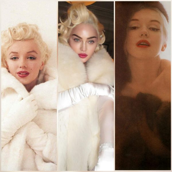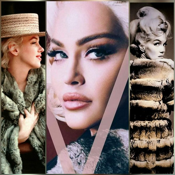 This image of Madonna in black jacket with a fur stole (below, at centre) conjures both Stern (right) and Marilyn’s 1958 shoot with Carl Perutz (left.)
