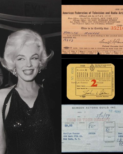 Marilyn’s 1959 Screen Actors Guild card and receipt ($2,560); her final AFTRA card ($2,560); and a photo of Marilyn arriving at the 1962 Golden Globes with Jose Bolanos, from the George Zeno Collection ($2,187.50.)
