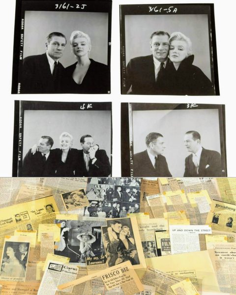Four vintage prints of contact sheet images, also by Milton Greene, showing Marilyn with Laurence Olivier and Terence Rattigan at a 1956 press conference ($256); and Marilyn’s press archive relating to their film project, The Prince and the Showgirl ($1,920.)