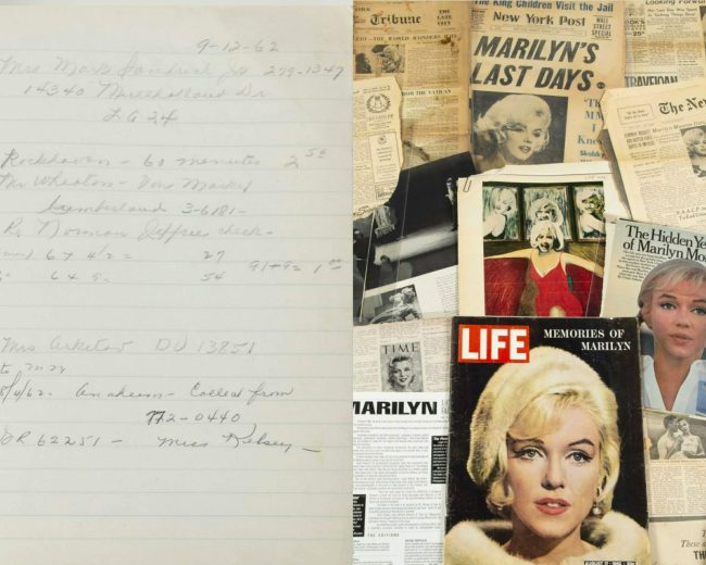 A 1962-3 notebook owned by Marilyn’s business manager Inez Melson ($896), including entries relating to Rockhaven Sanitarium, Marilyn’s former employees Eunice Murray and Norman Jeffries, and offers to buy her home after she died; plus, the largest selling press archive ($4,480), compiled in the years after her death, from the estate of Lee Strasberg.