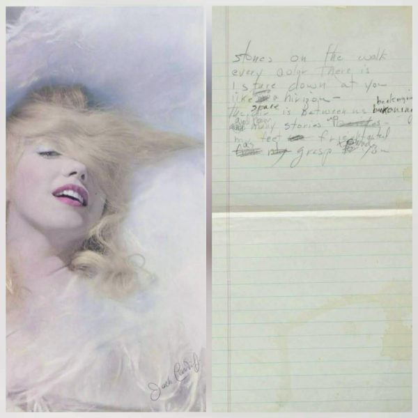 52 Marilyn-related lots were sold at the Icons & Idols: Hollywood event at Julien’s Auctions on December 2nd, 2021. Among them, my personal favourites are this signed portrait by Jack Cardiff, pastel-toned with ‘shimmery’ effect ($6,400); and a handwritten poem by Marilyn herself ($5,120), which reads as follows: “Stones on the walk/ every color there is/ I stare down at you/ like a horizon-/ the space-air is between us beckoning/ and I am many stories up/ my feet frightened/ as I grasp towards you …”