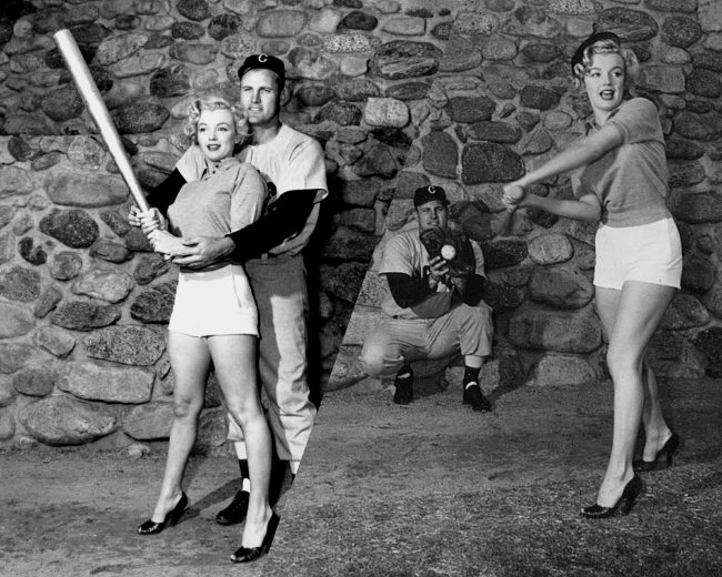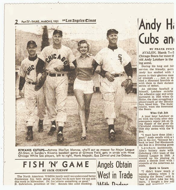 “In March 1951, she posed for a group of publicity photos with a trio of White Sox players — Joe Dobson, Hank Majeski and Gus Zernial — at training camp in Pasadena, Calif … Zernial was snapped walking alongside Monroe, both resting baseball bats against their shoulders. Another photo depicted Monroe, wearing short shorts and high heels, tagging a sliding Majeski at home plate with a baseball mitt, as Zernial and Dobson called their teammate out.
