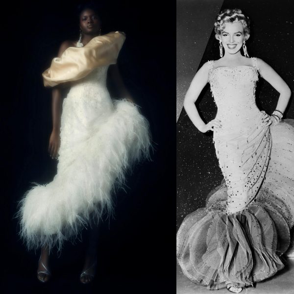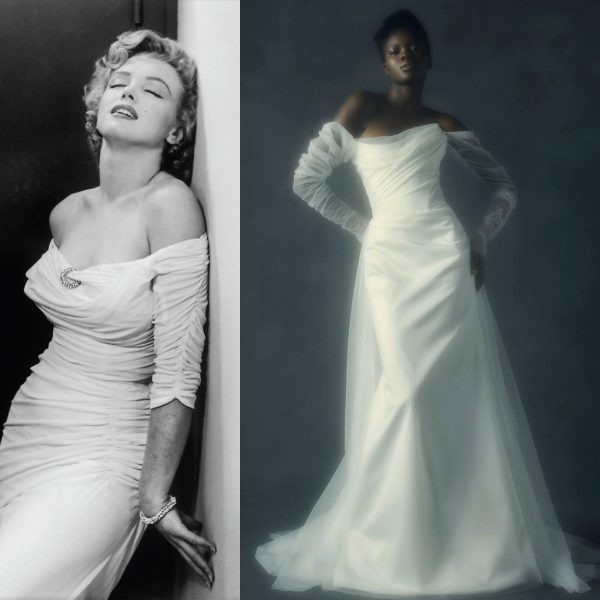 Marilyn’s style influence was also cited by Vogue in January, with Andreas Kronthaler channeling her vintage Hollywood glamour in a bridal gown for Vivienne Westwood‘s Summer 2022 runway collection, which reminded me of this fishtail gown designed by Travilla for the closing number of There’s No Business Like Show Business.