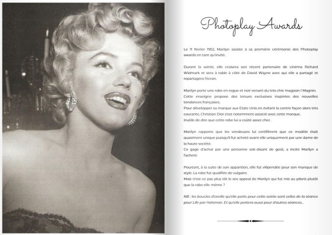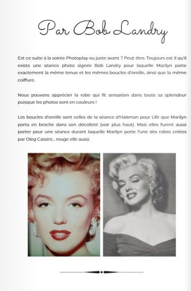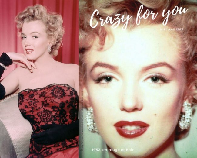 The latest issue of French e-zine Crazy For You takes a closer look at Marilyn’s photo session with Bob Landry. Her strapless red silk taffeta dress with black lace overlay was purchased from the I. Magnin department store, and now resides in New York’s French cultural embassy (see here.)
