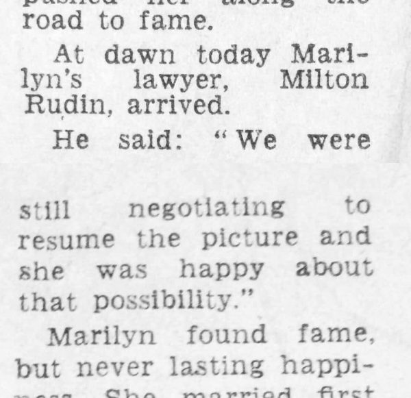 There’s just one error right at the end, when she writes that on July 10, 1962, Marilyn came to terms with Fox and ‘a new contract was drawn up.’