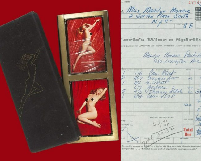 A 1950s set of playing cards featuring images from Marilyn’s nude calendar session with Tom Kelley fetched $2,560; and a liquor store receipt, billed to Marilyn in 1956, sold for $1,600.