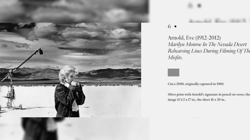 This gelatin print of Marilyn rehearsing a scene for The Misfits in the Nevada desert – with photographer Eve Arnold’s signature on the verso – has sold for $1,625 at Swann Gallery New York, as part of a Focus on Women event. (The highest selling item was a letter penned by Little Women author Louisa May Alcott, which sold for $23,750.)