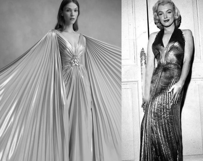 The British fashion designer Jenny Packham’s Resort 2023 Collection includes “a dazzling gown in a pleated gold lamé that recalled the Hollywood va-va-voom of Marilyn Monroe’s William Travilla dress in Gentlemen Prefer Blondes (1953),” Vogue reports. The matching cape also reminds me of another gold lamé ensemble worn by Marilyn when she met Queen Elizabeth II in 1956.