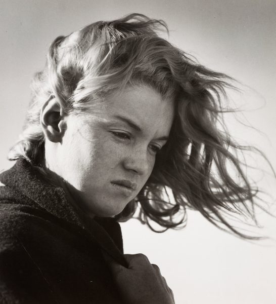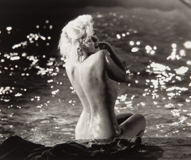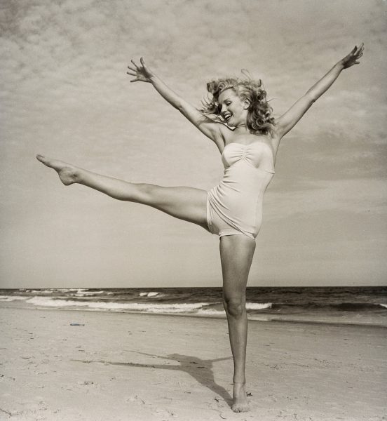 A selection of prints from photographer Andre de Dienes – from his travels in rural California with a brunette Norma Jeane, to a conceptual series with a newly blonde Marilyn on Malibu Beach – will go under the hammer as part of the Hollywood & Entertainment Signature event at Heritage Auctions next Saturday, July 23. Also on offer is a 1954 nude calendar; costume sketches for We’re Not Married!; Marilyn’s fishnet tights from Bus Stop; and a ‘pool scene’ shot from Something’s Got to Give, credited to William Read Woodfield, one of only two photographers present (he later sold the rights to Lawrence Schiller.)