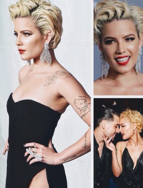 Halsey’s glamorous beauty routine included a red lip, subtle eye wings, and voluminous lashes. They paired the classic beauty with curly red hair. The shortened style included curled bangs and some pieces were tucked behind their ears. Halsey made the vintage look their own with the addition of dangling skeleton earrings.