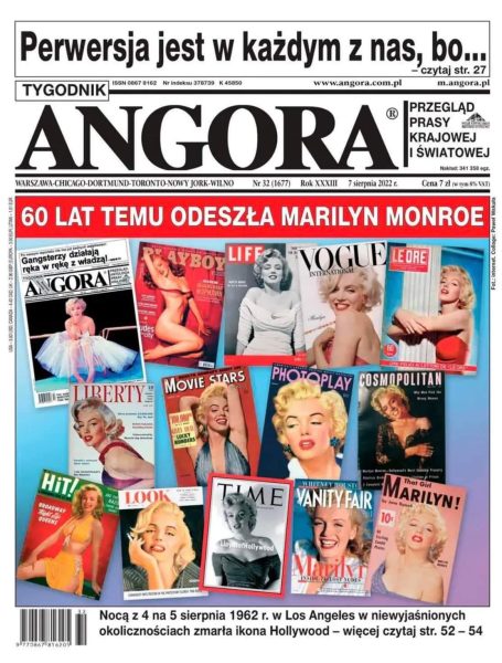 Following her recent appearances in PANI and High Heels Extra, Marilyn graces another Polish magazine cover this week. ANGORA is a news weekly and the latest cover features a selection of Marilyn’s magazine covers through the years – and inside is a 2-page article, ‘Sex, Love and Despair: Marilyn Monroe in Private,’ focusing on Anthony Summers’ reissued biography, Goddess.