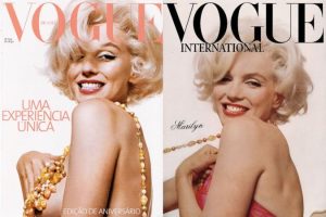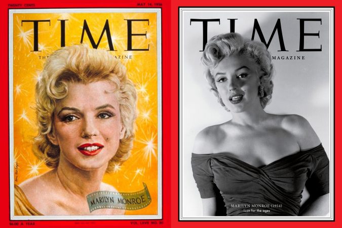 FYI: Although Marilyn did cover TIME in 1956, the image shown here is part of a 2020 online project, ‘100 Women of the Year,’ with Marilyn representing 1954. And the Vogue International cover is fan art, although Vogue‘s Brazilian edition published a similar cover (by Bert Stern) in 2003.