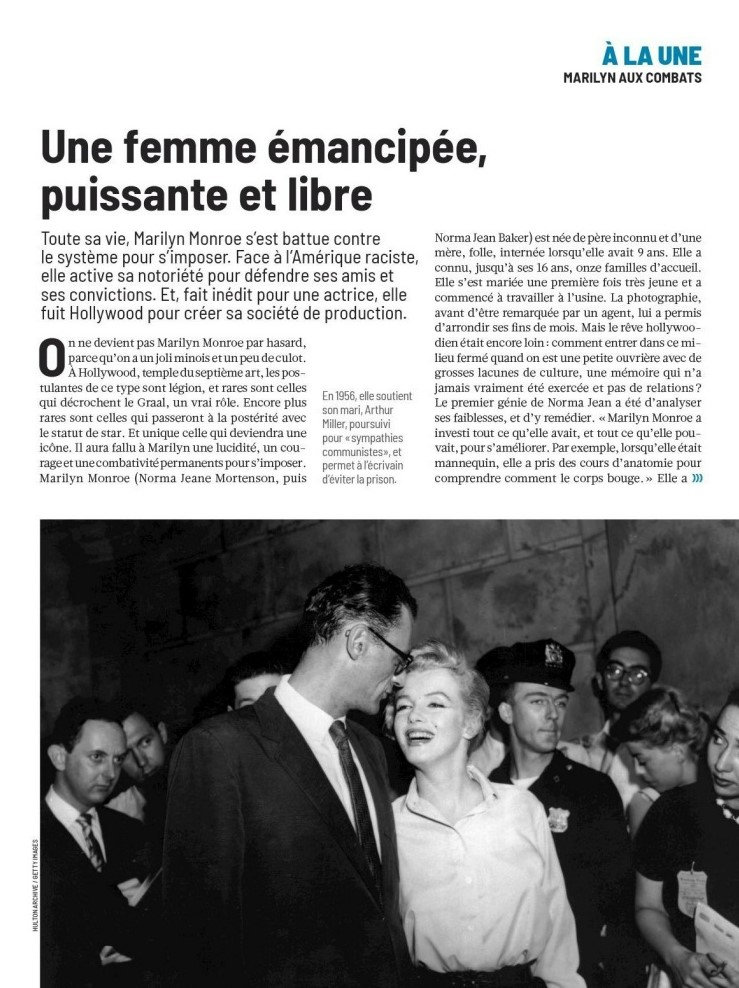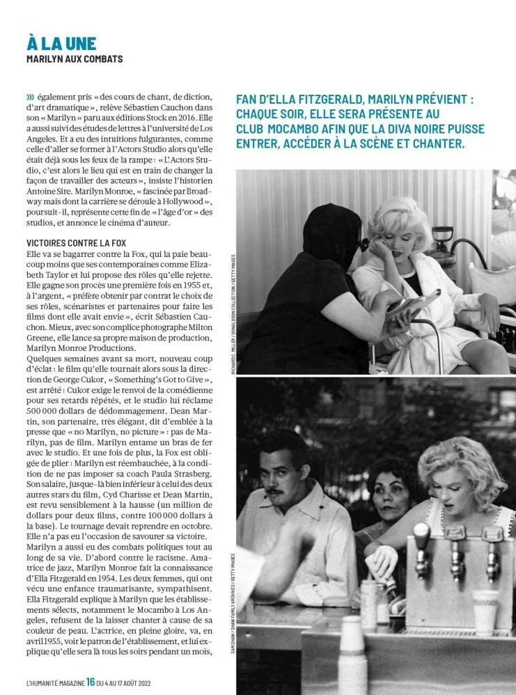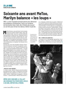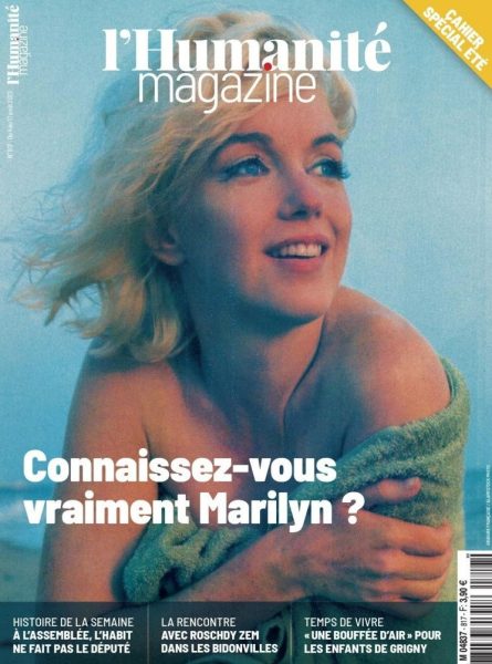 ‘Do you know the real Marilyn?’ is the question posed – alongside one of the last photos taken by George Barris at Santa Monica Beach in July 1962 – on the front page of l’Humanité magazine, a weekly supplement included in today’s edition of the French daily newspaper. Inside is a 10-page article, ‘Marilyn in Battle‘ by Caroline Constant, focusing on the feminist documentary, Marilyn: Woman of Today.