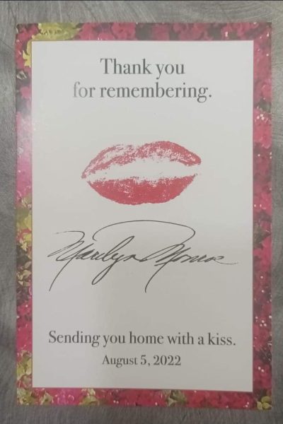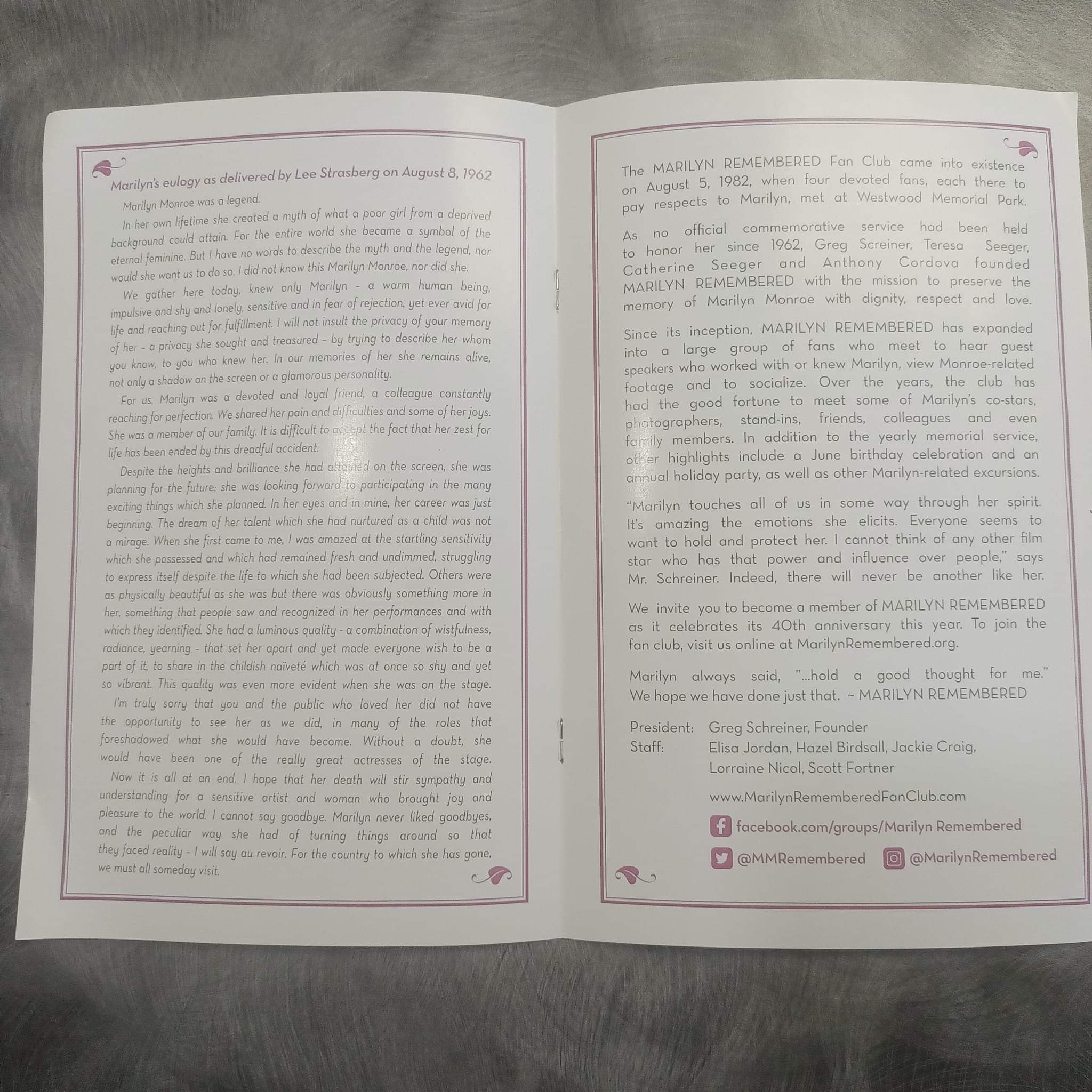 A service commemorating the 60th anniversary of Marilyn’s death was held at Westwood Memorial Park on August 5, 2022. Hosted by Greg Schreiner, president of the Los Angeles fan club Marilyn Remembered, the service commenced at 5:30 pm PST with a video montage from Silver Technicolor. (The service can be viewed in full here.)