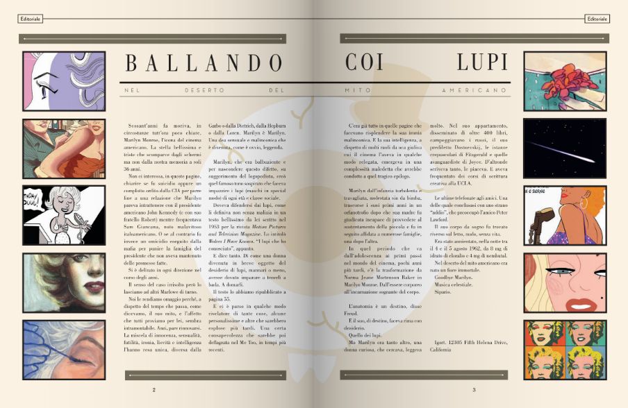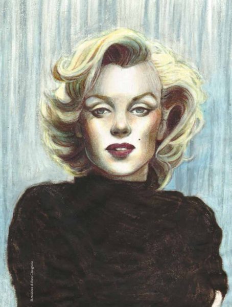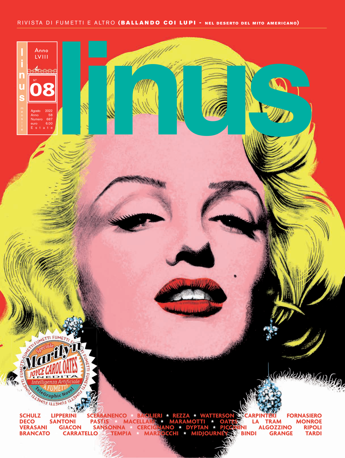 Another magazine cover for Marilyn this week – this Warholesque image (after Gene Korman’s ‘gold lamé dress’ shoot) covers the August issue of LINUS, an Italian monthly celebrating comic art. Inside, various artists and writers have contributed essays, imagery and comic strips for a 40-page special including Joyce Carol Oates’ latest short story, ‘Miss Golden Dreams 1949,’ and excerpts from her novel, Blonde; a look at Marilyn’s filmography, and a feminist perspective on her remarkable life; plus deep dives on Andy Warhol’s ‘Shot Marilyns‘ and Marilyn-inspired graphic novels. For readers outside Italy, the issue is also available for download via Kindle.