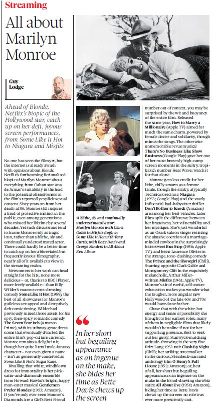 “Sixty years on from her death at 36, Monroe still inspires a kind of protective instinct in the public, even among generations who missed her lifetime by several decades. Yet such discussions tend to frame Monroe only as tragic icon, rather than a blithe, sly and continually underestimated actor. There could hardly be a better time to catch up on her abbreviated but frequently joyous filmography, nearly all of it available to view in the streaming realm.”