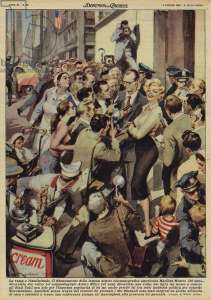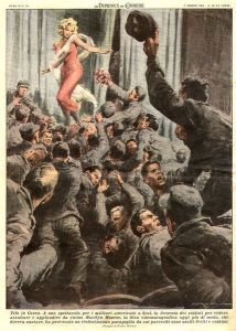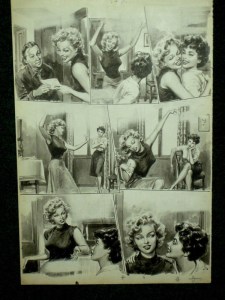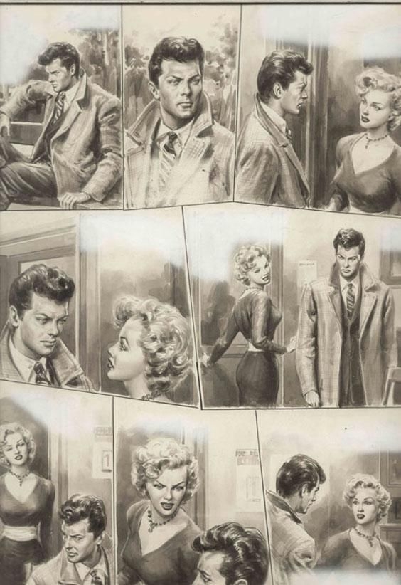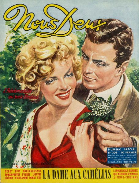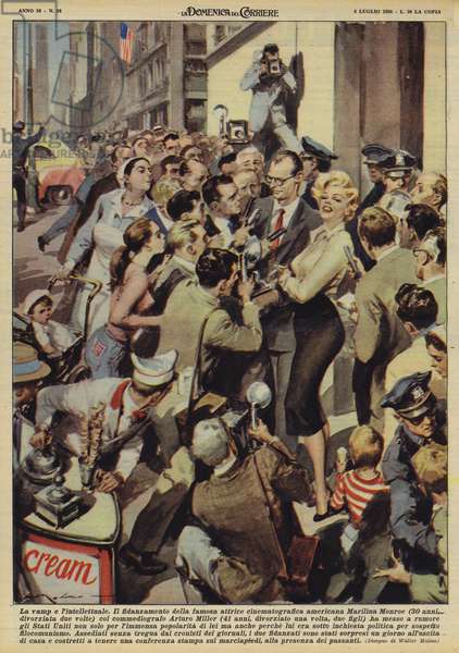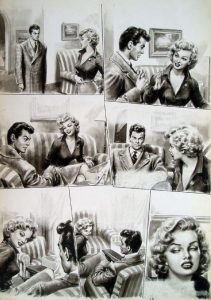 Grand Hotel was founded in 1946, and throughout the 1950s, Marilyn inspired its cover art by illustrator Walter Molino, as well as comic strips for the magazine’s romance stories. Some of his Grand Hotel artwork also appeared in the French publication, Nous Deux (‘We Two’), and he also created striking news-related images for another Italian weekly, La Domenica del Corriere.