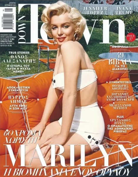 Yet another European magazine tribute to Marilyn on the 60th anniversary of her death, Down Town magazine’s September issue (#37) is now available in Greece. The cover photo was shot by Mischa Pelz in 1952, as part of a commercial layout for Deeco lawn furniture. According to Pelz, Marilyn had known him for some time and did the shoot as a friendly favour. The photos were rediscovered many years later by Pelz’s former assistant (who had purchased his studio), after a California earthquake when they tumbled off the shelf.