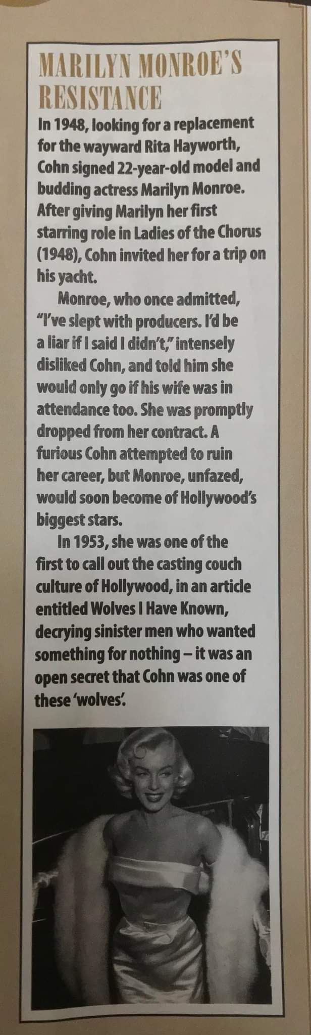 The latest issue of UK nostalgia mag Yours Retro (#53. with Grace Kelly on the cover) includes a 4-page article on Harry Cohn, the tyrannical founder of Columbia Pictures. Marilyn’s brief tenure at the studio where, in 1948, she had her first lead role in the B-musical, Ladies of the Chorus, and met her musician lover, Fred Karger, and acting coach Natasha Lytess – only to be fired after turning down a tryst with ‘King Cohn’ – is mentioned, alongside Cohn’s relentless bullying of leading ladies like Rita Hayworth and Kim Novak, who also evaded his sexual advances.