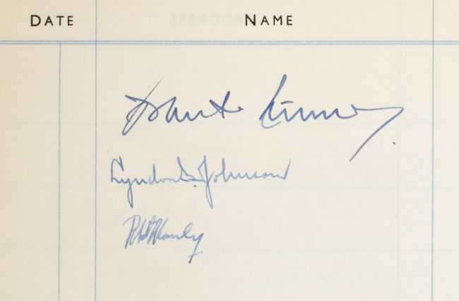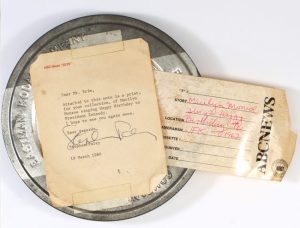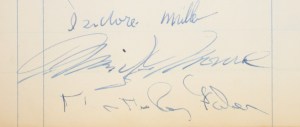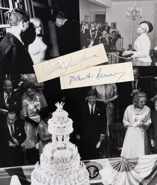 A treasure trove of items relating to the Democratic fundraiser at Madison Square Garden on May 19, 1962 goes under the hammer at Doyle Auctions in New York next Thursday, October 13, with an estimated price of $40,000-$60,000. From the estate of entertainment lawyer and DNC co-Chairman Arthur B. Krim and his wife, Dr. Mathilde Krim – who hosted the after-party at their home on East 69th Street – the archive includes a guestbook signed by Marilyn, Isidore Miller (who accompanied her that evening), President John F. Kennedy and his brother Robert (the Attorney General), over three pages; and footage of Marilyn singing ‘Happy Birthday Mr President,’ gifted to Arthur B. Krim by Stephen Paley, producer of ABC News’ 20/20, in 1980; as well as images captured by White House photographer Cecil Stoughton that evening, and three other guestbooks.