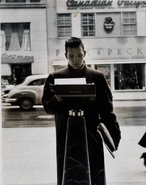 One day, while strolling on Fifth Avenue, he found himself in front of a shop that offered passers-by to write whatever came to their minds on an Olivetti machine placed on a tripod, as part of a photo report for Life magazine. James approached and wrote a single sentence: ‘Marilyn Monroe is a beautiful girl.’ His figure, wrapped in a long elegant coat, and his gaze lost in contemplation of these words, appeared in the magazine.