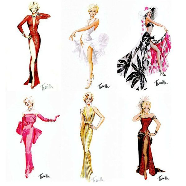 “There he met Monroe and began working with the rising star,” Luis Reyes writes. “As Monroe became the studio’s most important female star and a global sex symbol, Travilla literally fashioned an essential element of Marilyn’s appearance and imagery that retains its influence today … He designed the wardrobe for eight films with Monroe and, on many occasions, for her personal use to wear at events. Travilla emphasised Monroe’s curves in his designs, such as the memorable pink gown in the musical number ‘Diamonds Are a Girl’s Best Friend‘ from Gentlemen Prefer Blondes. He also designed the gold lamé dress from the same film, which at the time was considered risqué.”
