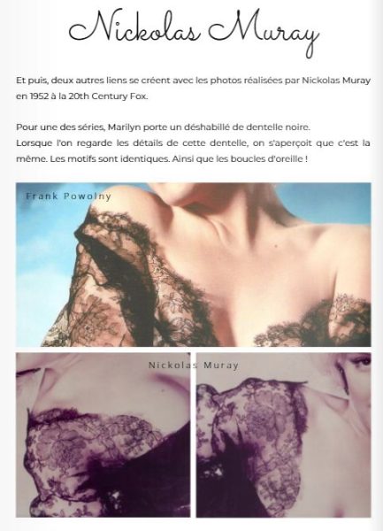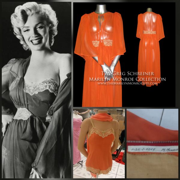The same hairstyle and earrings show up in another Frank Powolny shoot, in which Marilyn wears a lace-trimmed, orange teddy and peignoir (now in the collection of Greg Schreiner.) Therefore, it’s quite likely that all four layouts were shot on the same day.