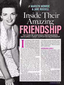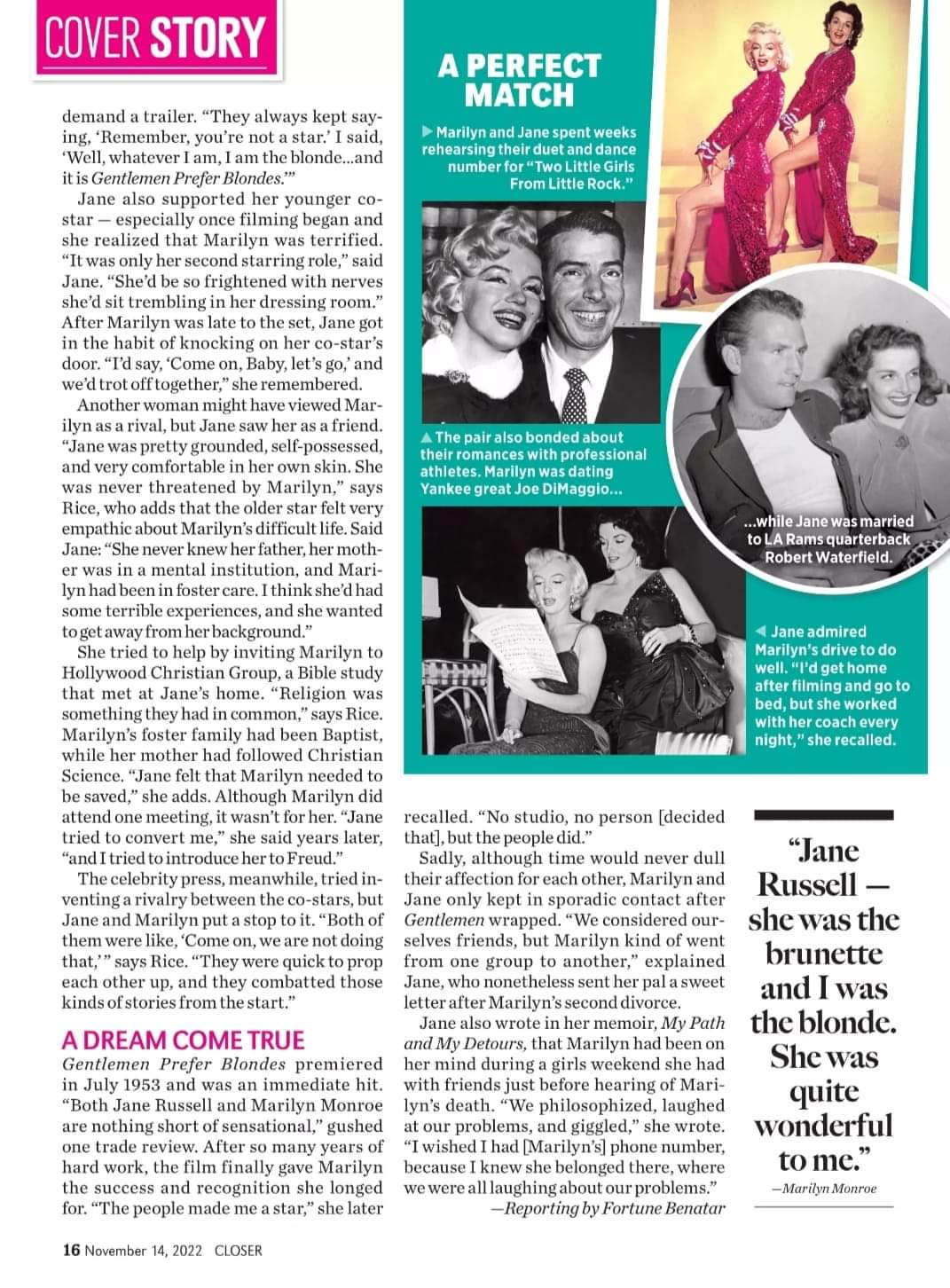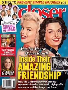 Jane Russell was arguably Marilyn’s most effective co-star – and the two bombshells bonded offscreen as well. In a cover story for US magazine Closer Weekly‘s November 14 issue, Jane’s biographer Christina Rice talks about their friendship. (More about Christina’s book here – and for fans in the UK, Closer USA hits newsstands a week or two after its domestic release.)