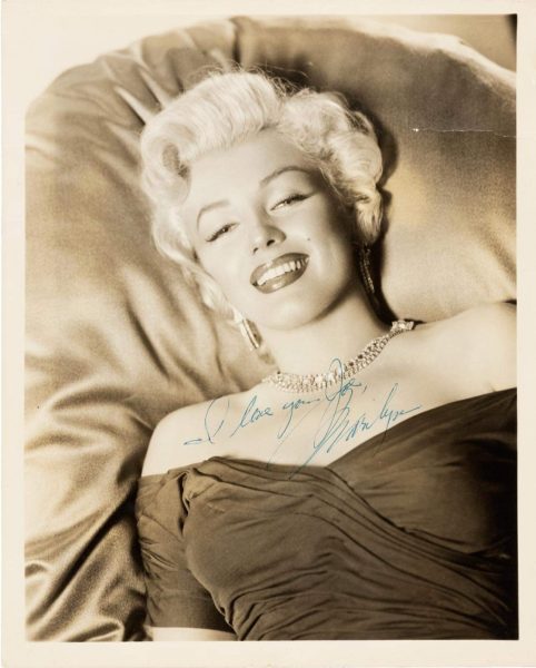A photograph signed by Marilyn to husband Joe DiMaggio sold for $300,000 at Heritage Auctions yesterday – setting a new record for a signed Monroe photo. The studio publicity image, shot by Frank Powolny in 1952 (see here) is inscribed in Marilyn’s own hand with this simple but touching message: ‘I love you Joe, Marilyn’.
