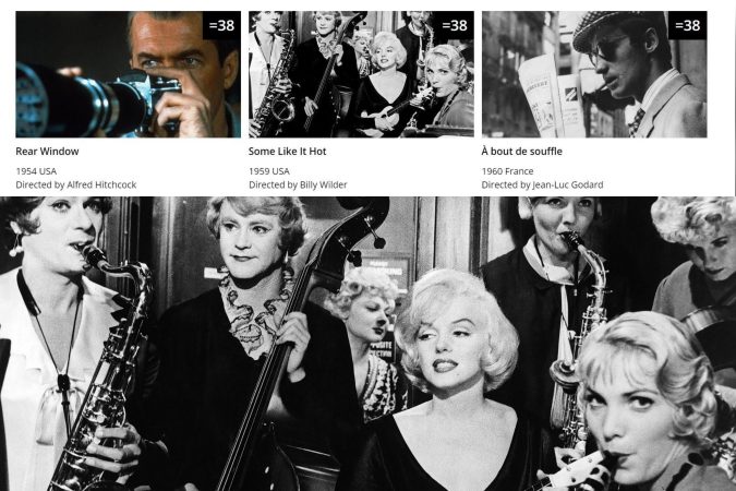Some Like It Hot (1959) takes 38th place in Sight and Sound magazine’s poll of the 100 Greatest Films of All Time – moving up four places since the last poll in 2012. Billy Wilder’s comic masterpiece shares this ranking with Alfred Hitchcock’s Rear Window (1955) and French auteur Jean-Luc Godard’s groundbreaking 1960 debut, À Bout de Souffle (Breathless.) Critic Alan Jones cites “Marilyn Monroe at the peak of her incandescence” among his reasons for nominating Some Like It Hot.