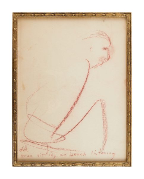 “Titled ‘Old Man sitting on a bench listening,’ Marilyn’s conte crayon on paper sketch is a monochromatic abstract portrait of a man leaning forward. The title is written along lower edge of sheet. The drawing is unsigned and framed in a gilt wood frame.”