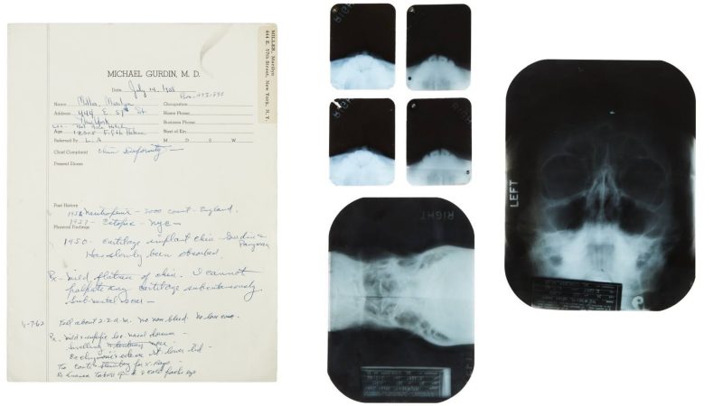 “A medical file pertaining to cosmetic surgery performed on Marilyn Monroe. The file includes facial X-rays and doctors’ notes from the office of Dr. Michael Gurdin, M.D., and the X-ray office of Drs. Conti and Steinberg. Dr. Gurdin’s chart on Monroe begins on July 14, 1958, and lists the patient as Marilyn Miller with addresses in New York and Los Angeles.