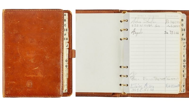 “A personalised brown leather, six-ring Gucci address book with custom stamped ‘M.M.’ on the front cover, that belonged to Marilyn (circa 1955) with handwritten entries, many in her own hand.