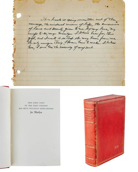- “A single piece of lined paper torn from a spiral-bound notebook, heavily stained, containing a notation in Arthur Miller’s hand reading ‘This book is being written out of the courage, the widened view of life, the awareness of love and beauty, given to me by my love, my wife-to-be, my Marilyn. I bless her for this gift, and I write it so that she may have from me the only unique thing I know how to make. I bless her, I owe her the discovery of my soul.’ Although the note is undated, Miller refers to Marilyn as his wife to be, indicating that it was written prior to their marriage on June 29, 1956. Although this dedication did not appear in any of Miller’s books it was possibly intended to be used in A View from the Bridge, which Miller was rewriting as a two-act play. Because Miller was not officially divorced until June 1956, it is possible that the dedication was not used due to timing.” – SOLD for $2,240