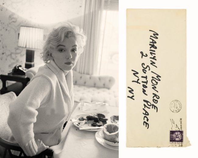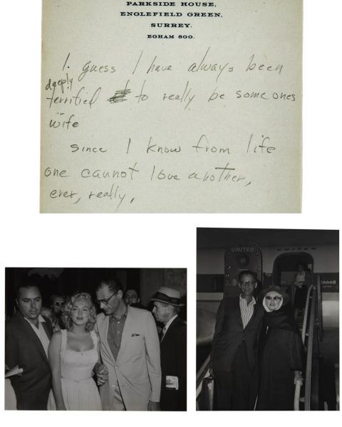 - “A single sheet of stationery from Parkside House, the English manor where Monroe and Arthur Miller stayed in Surrey while she filmed The Prince and The Showgirl in London in 1956. The note reads ‘I guess I have always been deeply terrified to really be someone’s wife since I know from life one cannot love another, ever, really.’ Monroe had just entered her third marriage and was on location with her new husband, Arthur Miller.” – SOLD for $21,875