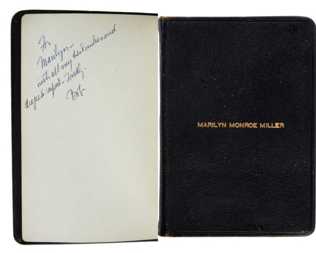 “A Union Prayer Book for Jewish Worship. The cover is stamped ‘Marilyn Monroe Miller’ and inscribed … ‘For Marilyn – with all of my best wishes and deepest respect – fondly, Bob’ [Probably Robert Goldburg, the Rabbi who oversaw her conversion in 1956.]”