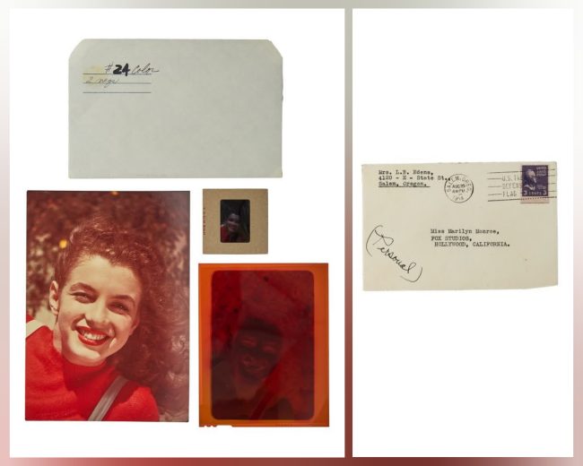 - A David Conover colour negative of Norma Jeane Dougherty numbered negative 17. The 1945 image shows her in a red sweater with white suspenders. Together with a printed colour copy. – SOLD for $4,480