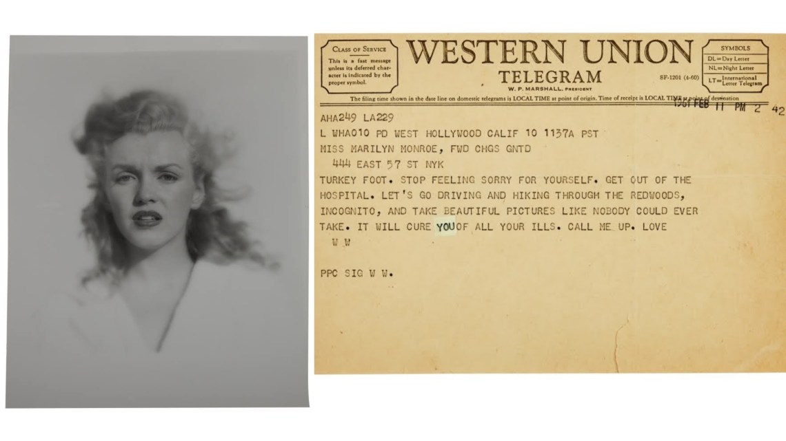 - “From the Personal Files of Marilyn Monroe: A February 11, 1961 telegram sent to the star from early photographer and friend Andre de Dienes, reading, ‘Turkey Foot, stop feeling sorry for yourself. Get out of the hospital. Let’s go driving and hiking through the redwoods, incognito, and take beautiful pictures like nobody could ever take. It will cure you of all your ills. Call me up. Love, WW.’ [Marilyn’s nickname for Andre was ‘Worry-Wart.’] The day prior, Marilyn had been released from Payne Whitney hospital’s psychiatric unit, following a horrifying stay, tricked into admitting herself thinking it was for rest and relaxation. She spent the next three weeks at Columbia Presbyterian Medical Center recuperating.” – SOLD for $2,560