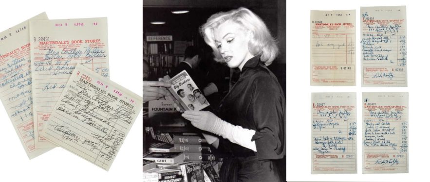 - “Three receipts from Martindale’s Book Stores in Los Angeles with dates in 1958 [while Marilyn was filming Some Like It Hot.] Titles of various books purchased include, Collected Short Stories by Dorothy Parker, Red Arrow, and Peace in Piccadilly. – SOLD for $1,024
