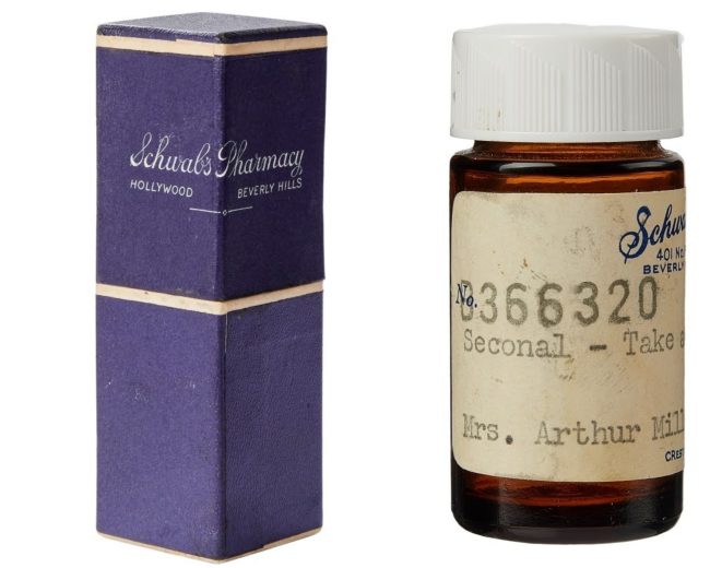 - “An empty prescription bottle of Seconal. The brown glass bottle with a white twist-off plastic lid features a label from Schwab’s Pharmacy in Beverly Hills and the prescription is made out to Mrs. Arthur Miller by Dr. Hyman Engelberg. The label features prescription number B366320 and reads ‘Seconal / Take as directed.’ The prescription is dated August 13, 1960 [Marilyn was filming The Misfits at the time.]” – SOLD for $12,500