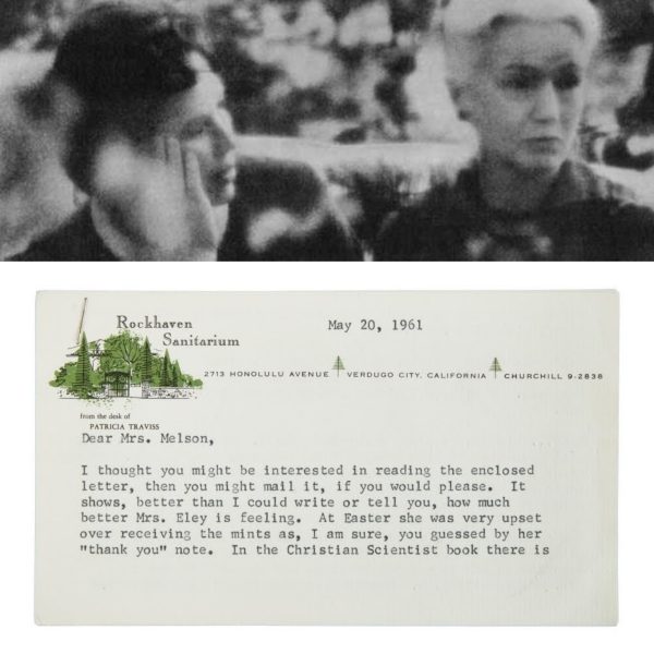 One of several letters from Patricia Traviss, manager of Rockhaven Sanitarium, to Inez Melson, Marilyn’s financial manager and legal guardian to her mother, Gladys Pearl Eley, a resident since 1953: “This four-page letter, dated May 20, 1961, is typewritten on two pages of Rockland Sanitarium letterhead and concerns the ‘ups and downs’ of Mrs. Eley’s mental health.”