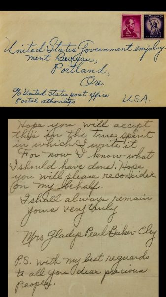 “An envelope and three-page letter handwritten in pencil by Marilyn’s mother, Gladys Baker Eley, to United States Government Employ, Portlant (sic), Oregon. The return address on the letter is the location of Rockhaven Sanitarium, where she was institutionalised in 1953. Marilyn paid for her care there. In the letter, Mrs. Eley writes about her past employment in 1945 and the concern she had, as a follower of Christian Science, at being asked to work with medicine.”